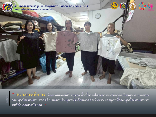 สำนักงานพัฒนาชุมชนอำเภอบางบัวทอง นำโดย นางนุสรา ธรรมฤาชุ พัฒนาการอำเภอบางบัวทอง พร้อมด้วยเจ้าหน้าที่พัฒนาชุมชน ลงพื้นที่ตรวจสอบโครงการที่ยื่นขอรับการสนับสนุนงบประมาณจาก กองทุนพัฒนาบทบาทสตรี ประเภทเงินทุนหมุนเวียน ของกลุ่มสตรีนวัตกรรมแปรรูปผ้าไทย ตำบลบางรักพัฒนา เพื่อประเมินความพร้อมของกลุ่มสตรีในการดำเนินกิจกรรมการผลิต การบริหารจัดการกลุ่ม ความสามารถในการต่อยอดผลิตภัณฑ์ผ้าไทย และศักยภาพในการนำทุนหมุนเวียนไปใช้ให้เกิดประโยชน์สูงสุด