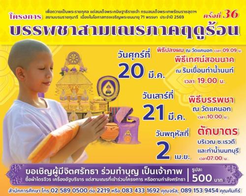 บวชฟรีไม่เสียค่าใช้จ่าย โดยกำหนดเข้าฝึกอบรมในระหว่างวันที่ 19 มีนาคม - 2 เมษายน 2569 ณ วัดแคนอก