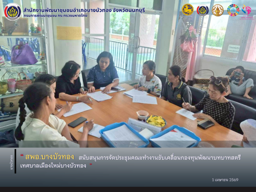 สำนักงานพัฒนาชุมชนอำเภอบางบัวทอง นำโดย นางนุสรา ธรรมฤาชุ พัฒนาการอำเภอบางบัวทอง มอบหมายให้นางสาวกนกพร สุทธิพันธ์ นักวิชาการพัฒนาชุมชนชำนาญการ สนับสนุนการจัดประชุม คณะทำงานขับเคลื่อนกองทุนพัฒนาบทบาทสตรีเทศบาลเมืองใหม่บางบัวทอง เพื่อร่วมกันขับเคลื่อนการดำเนินงานของกองทุนพัฒนาบทบาทสตรีในระดับพื้นที่ให้เป็นไปอย่างมีประสิทธิภาพ และประชาสัมพันธ์การรับสมัครสมาชิก กองทุนพัฒนาบทบาทสตรี เพื่อเปิดโอกาสให้สตรีในพื้นที่เทศบาลเมืองใหม่บางบัวทอง ได้เข้าถึงแหล่งเงินทุนในการประกอบอาชีพ ดอกเบี้ยต่ำ ณ เทศบาลเมืองใหม่บางบัวทอง ตำบลบางบัวทอง อำเภอบางบัวทอง จังหวัดนนทบุรี